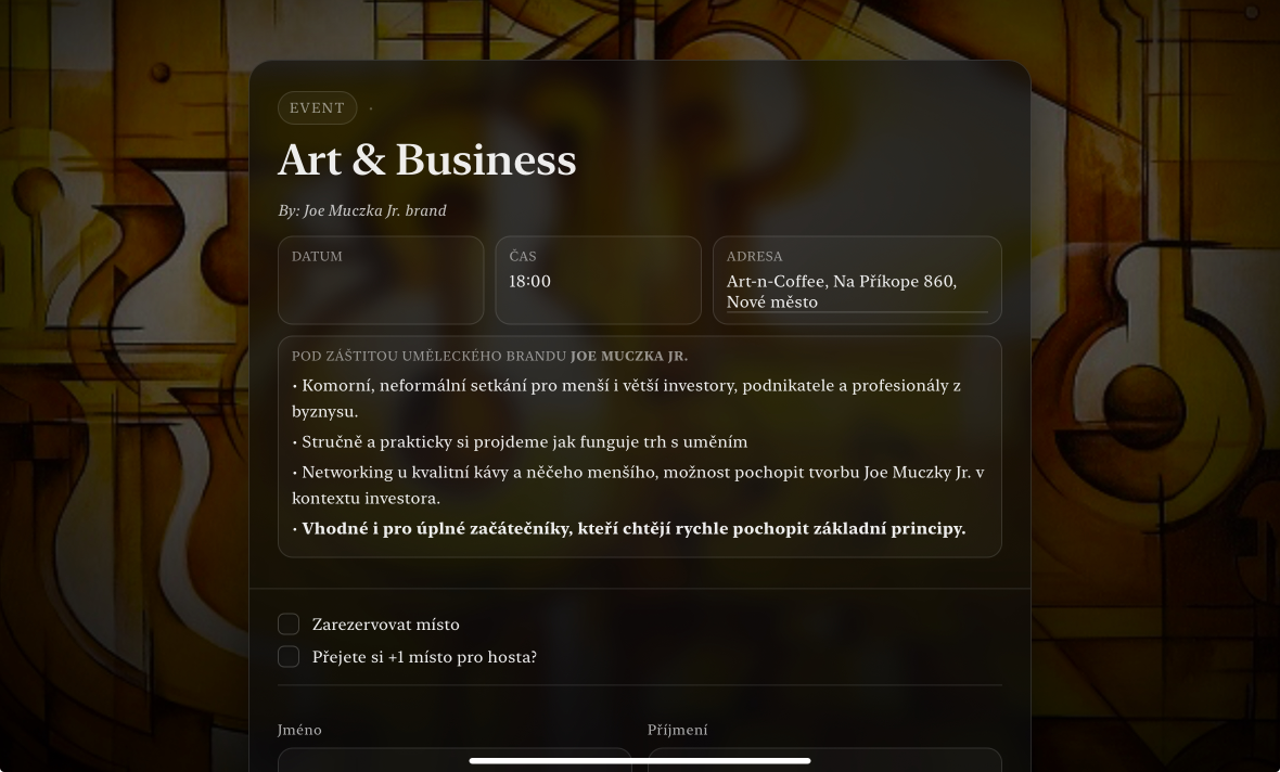 Pod záštitou uměleckého brandu Joe Muczka Jr.• Komorní, neformální setkání pro menší i větší investory, sběratele, podnikatele a profesionály z byznysu.• Stručně a prakticky si projdeme jak funguje trh s uměním• U kvalitní kávy a drobného pohoštění máte možnost pochopit tvorbu nejen Joe Muczky Jr. v kontextu investora.• Vhodné i pro úplné začátečníky, kteří chtějí rychle pochopit základní principy.Program18:00 = Přivítání18:15 = Prezentace19:30 = Volná zábava